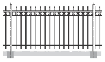 som lukkes i top med plastprop og hegns modulfelter med runde lodrette balustre som samles på stolperne med specialbeslag.